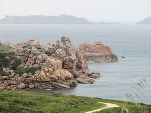 Het is ineens heel ander weer. Bewolkt en veel wind en af en toe wat regen. Na de camper weer van schoon water en zo te hebben voorzien vertrokken we na tienen vanaf de camping om de roze rotsen bij Ploumanac'h te bekijken. We konden helaas geen geschikte parkeerplaats vinden. In het plaatsje zelf was alles vol. Er buiten was er ook een maar die was niet toegankelijk voor campers. Iets verderop was wel een uitzichtspunt waar we zijn gaan staan. Maar we zaten toen hoog boven het pad wat we wilden lopen. Afdalen was geen optie en de regen speelde ook nog op. Dus verder dan een foto vanaf boven zijn we niet gekomen.
