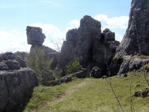 Gisteren hadden we van de eigenaar van het restaurantje gehoord dat je op de hoogvlakte, de Causses Mejean, tussen de gorges goed kon wandelen. Het is er echter wel kaal maar er is ook een bezienswaardigheid namenlijk de Chaos de Nîmes-le Vieux waar door de erosie de hardere rotspartijen zijn blijven staan. Het is hier dus een ruig landschap. En er is een pad van 4 km door uitgezet.